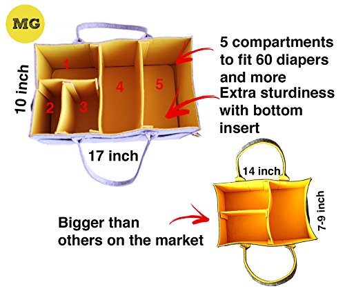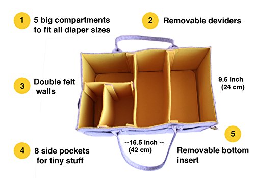 - LARGE SIZE DIAPER CADDY fits 60 diapers and lots of baby accessories our lightweight yet sturdy tote bin is 16.5" x 9.5 x 7" (The Largest among other brands) fits diapers of all sizes from newborn to toddler. You can store regular or cloth diapers, wipes, bibs, onesies, baby toys, burp cloths, pacifier binky, teethers, security blanket, books, bibs, diaper rash cream and more!