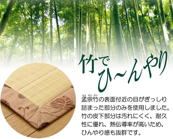 孟宗竹の表面付近の目がぎっしり詰まった部分のみを使用しました。表面部分は汚れにくく、耐久性に優れ、熱伝導率が高いため、ひんやり感も抜群です。1.4mmの細ヒゴを使用しています。竹を細ヒゴにする事で硬いイメージのある竹がやわらかく、しなやかになります。またクッション性にこだわり中材にウレタンを使用しました。裏には不織布を貼っていますので、フローリングでのご使用に適しています。竹は他の木材と比べると、格段に成長が早く(3~5年で成竹)、持続的生産が可能な環境に優しいサスティナブルな素材です。