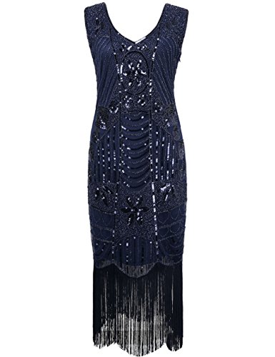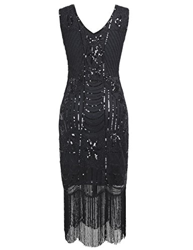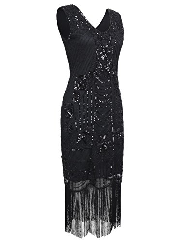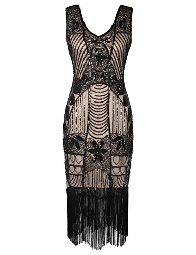 Fantastic,sophisticated and artistic, This sequin beaded flapper dress is extremely a vintage recreation with a modern edge. Whether you're looking for a unique dress for prom or homecoming or a perfect vintage frock to wear to a formal work event, this intricately decorated 1920s-style dress is a stunning choice which will flatter any figure. The shift shape is covered with elaborate art deco swirls, flowers and linear shapes made of beading and sequin. A slight V-neck and V-shaped back create a modest neckline, the scalloped fringed hemline adds a uniquely vintage look that will make you feel just like a true flapper.Feature