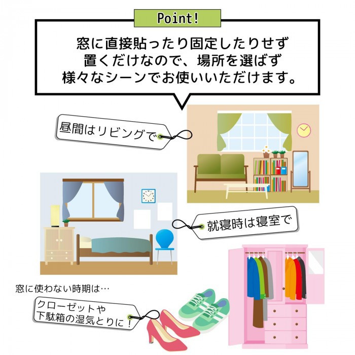 | 結露を防ぐB型シリカゲルがぎっしり入ったシリカゲルクッションです。窓の下に置くだけで侵入してくる隙間風も防ぎます。置くだけで利用できるので、リビングや寝室に持ち運びができ大変便利です。また、天日干しをすると繰り返し使用できます。 |