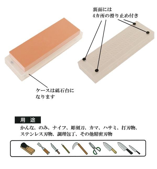 本職の仕事に輝きを生む天然砥石。なめらかな研ぎ感であらゆる鋼材の刃物に素早く刃付けが可能です。ケースは砥石台になるので、使用・保管が快適で衛生的。ケース裏には4カ所の滑り止めが付いています。 |