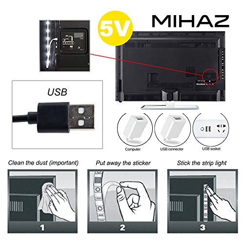 Installation:Before installation, clean the dust, ensure the back of your TV is free from dust before installation to avoid falling off 1.Cut(if necessary): Cut On the Cut Marks on the strip to desired length 2.Peel: Remove the adhesive backing on the strip 3.Firmly Press the strip in desired place and Connect the USB to USB port