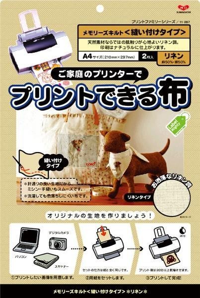 家庭用のインクジェットプリンタで、生地にプリントができます。肌触りが心地よいリネン調で印刷はナチュラルな仕上がりです。布を使った雑貨やタグなど、小物作りにピッタリ。 |