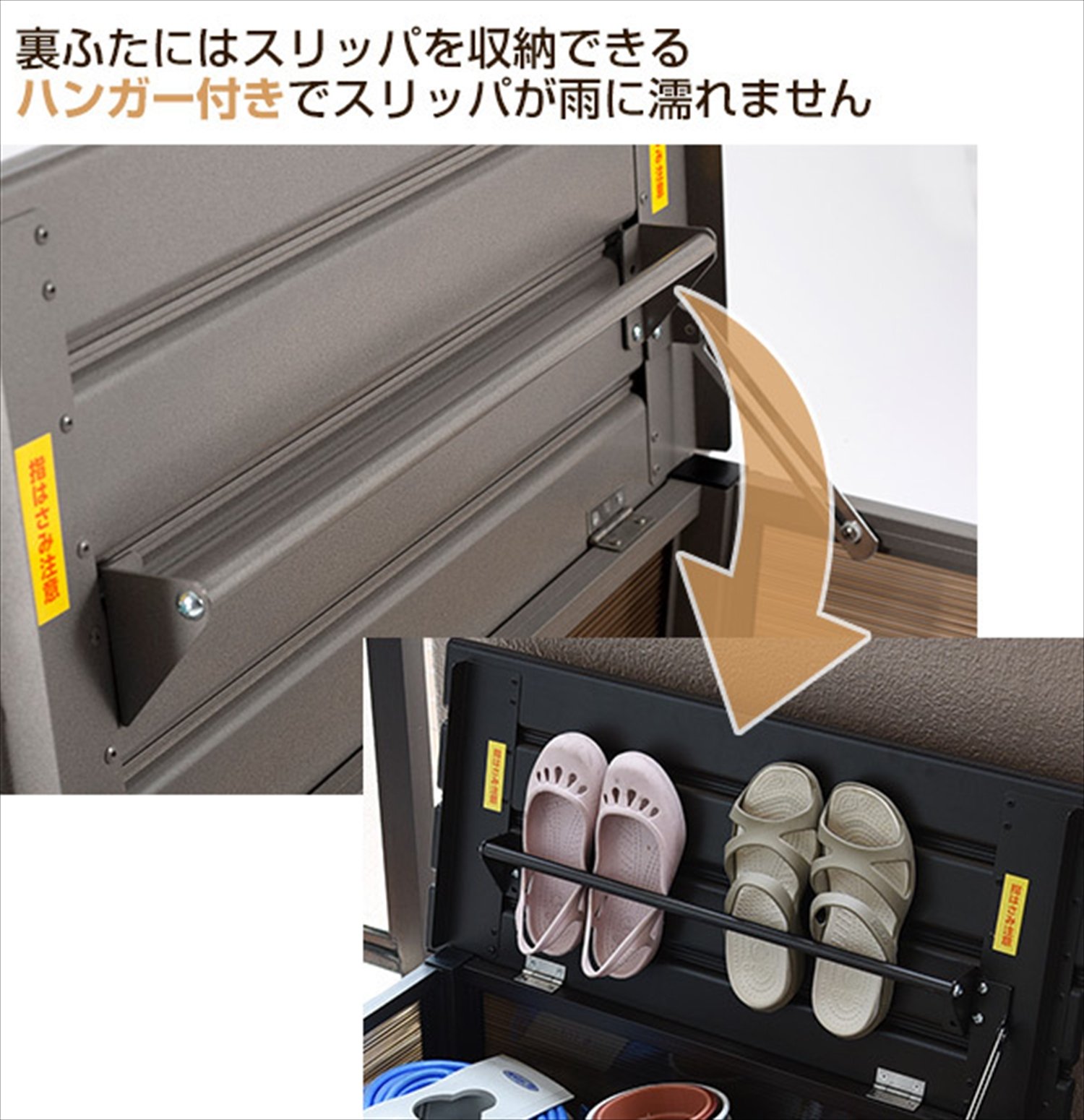 ● The back lid is equipped with a hanger to store sandals to prevent sandals get wet in the rain