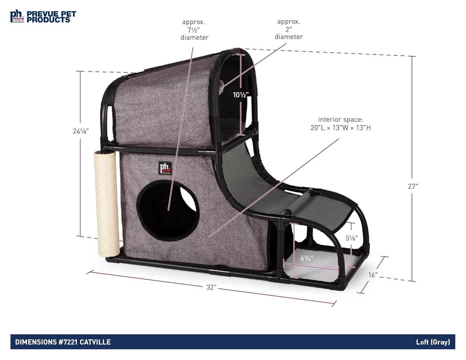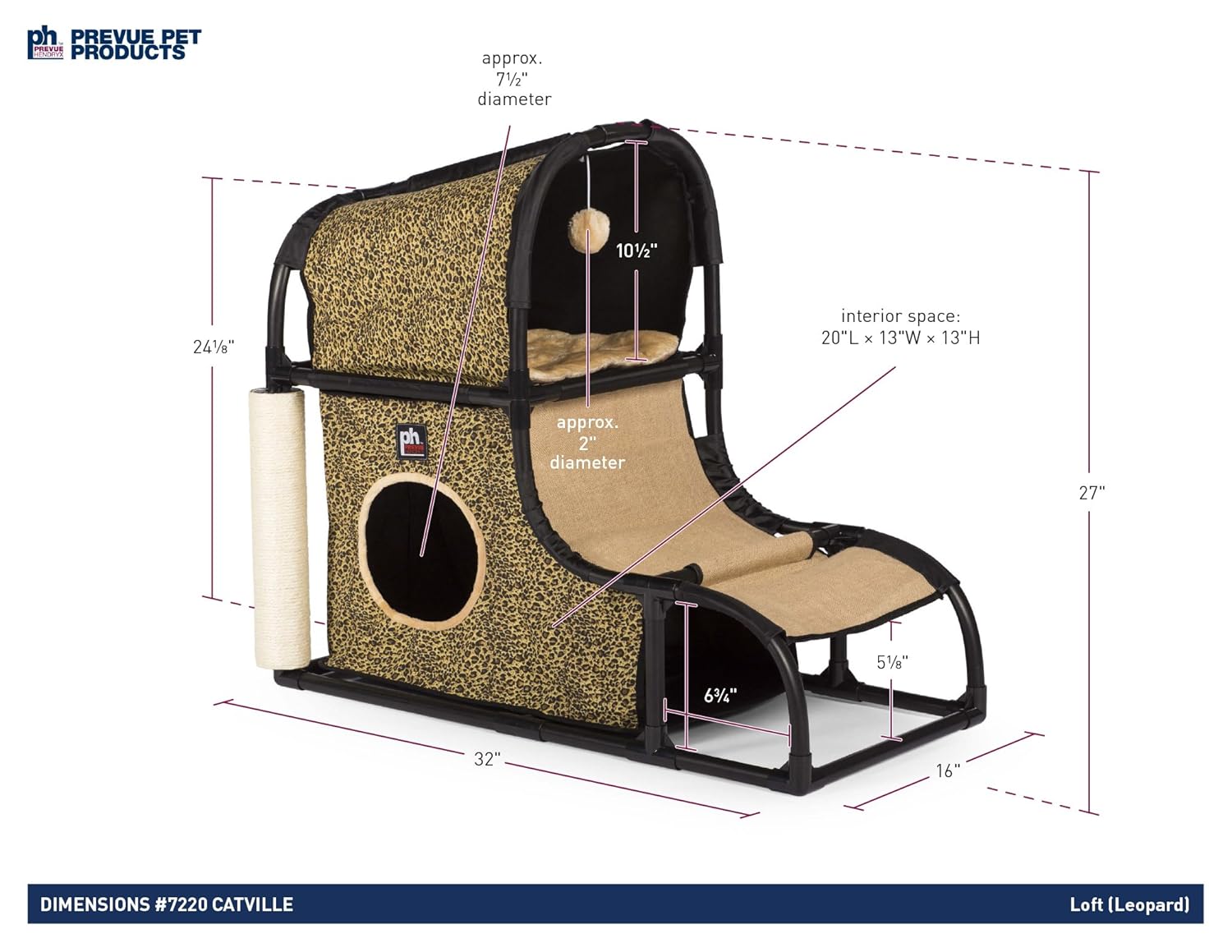 Prevue Pet Products Catville Loft 7220 in Leopard Print encourages your cat to be healthy, happy and active! Watch as kitty engages in frisky activity – playing with the dangling toy, scratching the sisal covered post or climbing in, out, over and around the Catville Loft. The hideaway arch provides an elevated view and contains super-soft plush bedding, perfect for relaxing or sleeping. Durable cloth rampway designed for active jumping, pouncing and running leads to the raised nook where a dangling puff-ball toy hangs playfully. Cats will scratch and stretch along the sisal covered post, getting a good workout while grooming nails and exercising paws. A lower, secluded, hideaway den provides a safe and secure feeling and is also ideal for playing hide & seek. With areas for playing, napping, lounging, scratching, pouncing, climbing and hiding felines love the full range of amenities created to satisfy behavioral instincts while discouraging destructive behavior and alleviating boredom. Prevue’s Catville Loft 7220 is an attractive home for cats of all ages and activity levels. Sturdy, yet lightweight, our leopard print loft comes with easy to follow, step-by-step, assembly instructions and measures 32" Long, 16" Wide, 27" High. Fabric components may be hand washed and air dried as needed.