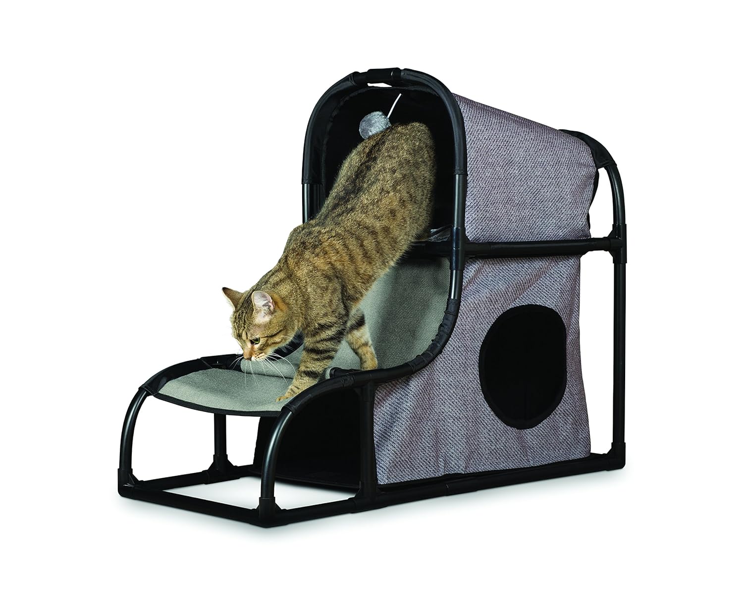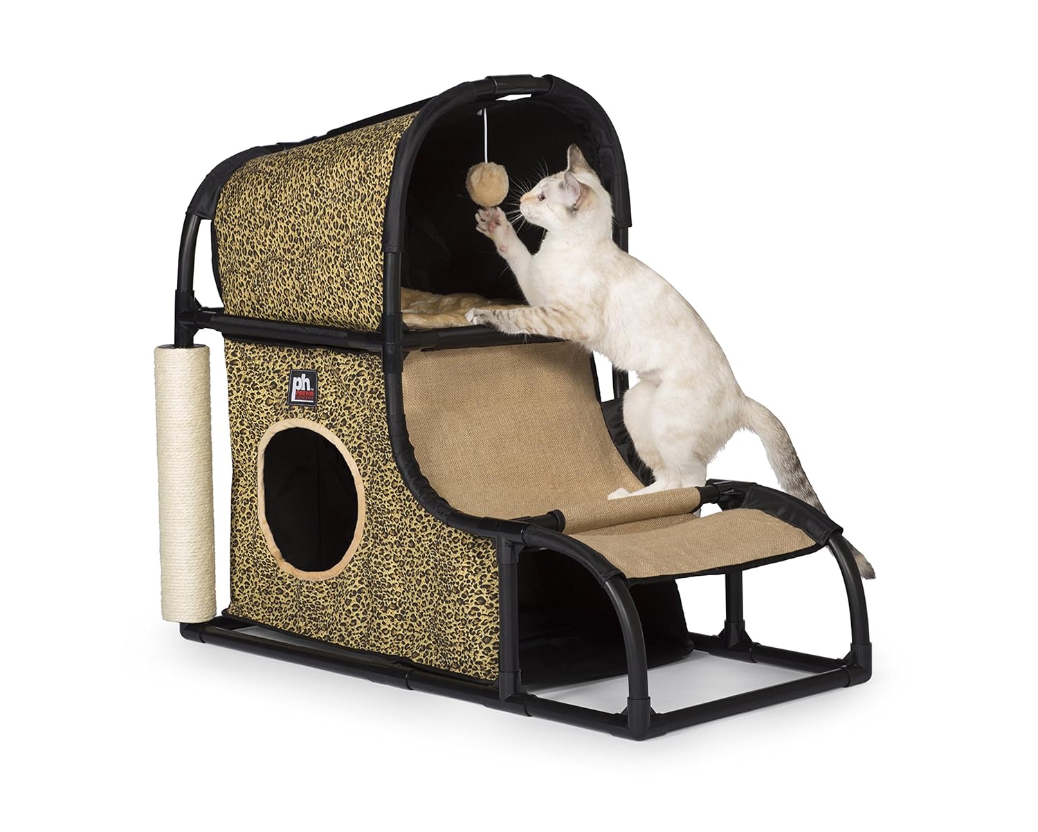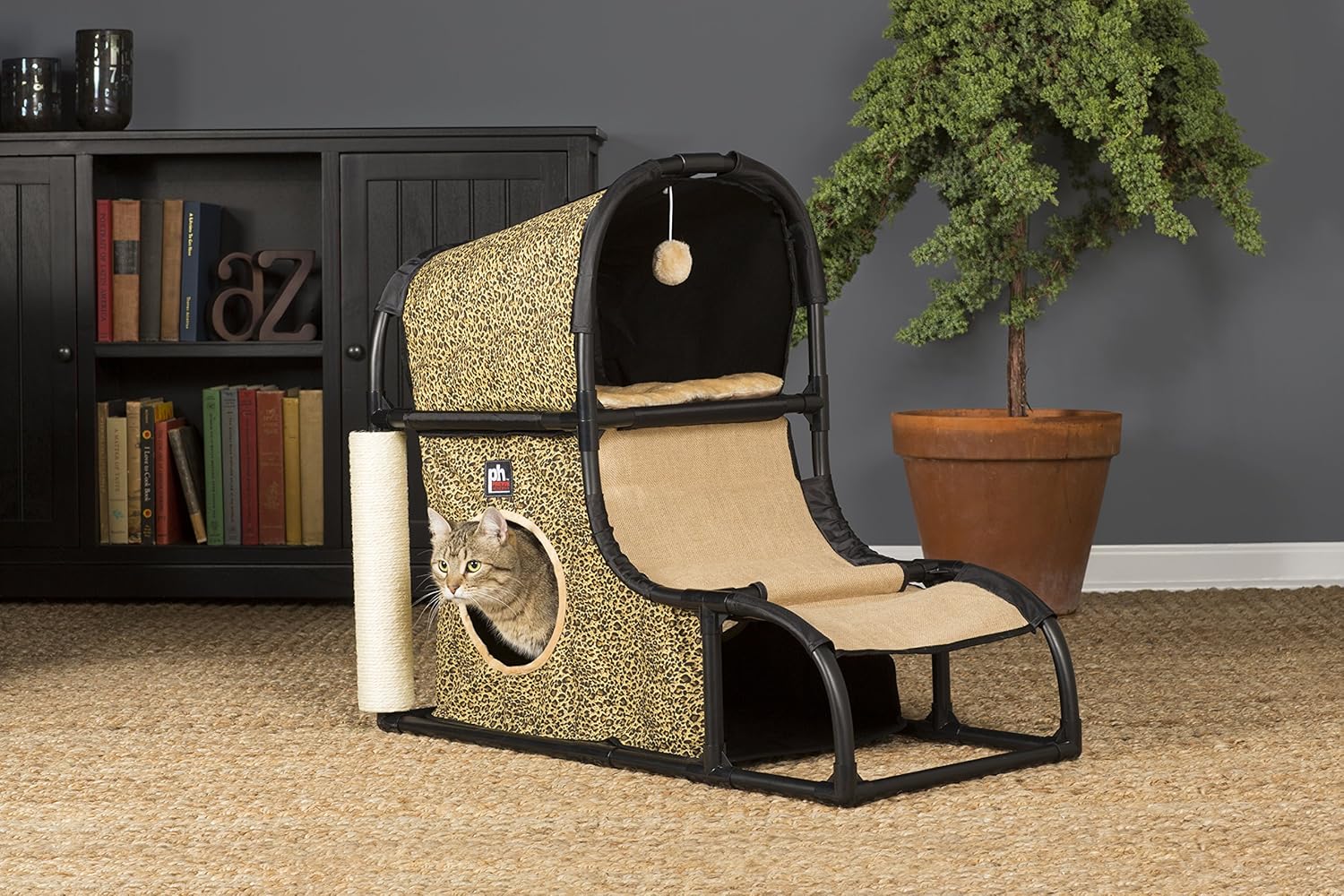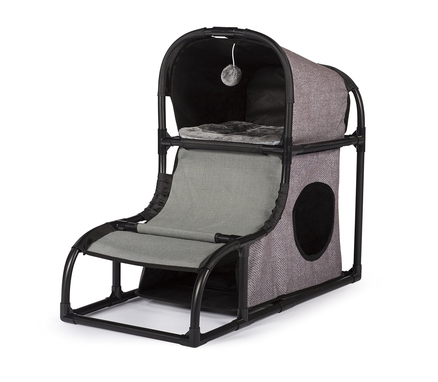 - Two hideaways - an elevated nook with dangling puff ball toy and plush mat plus a more secluded, lower hideaway