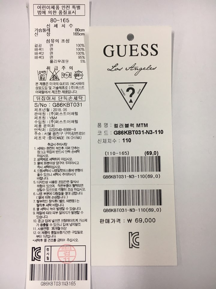 게스 오리지날 무드의 맨투맨 티셔츠로 시그니처 컬러를 블럭킹하여