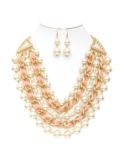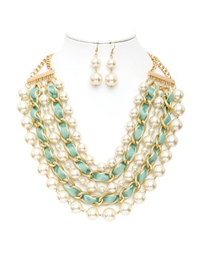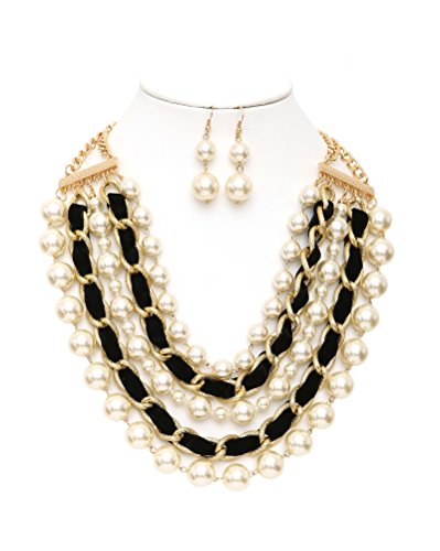 Necklace features a combination of simulated pearl strands and velvet intertwined chain. It also has a lobster clasp closure and adjustable chain. Dropping earrings feature two simulated pearls and french wire hook.