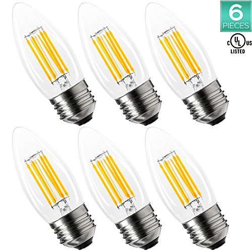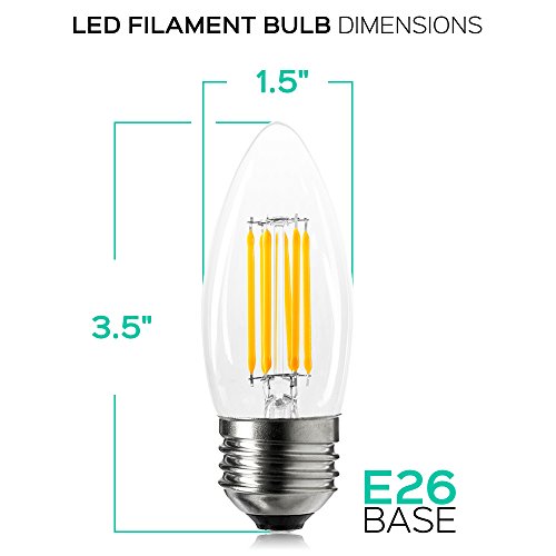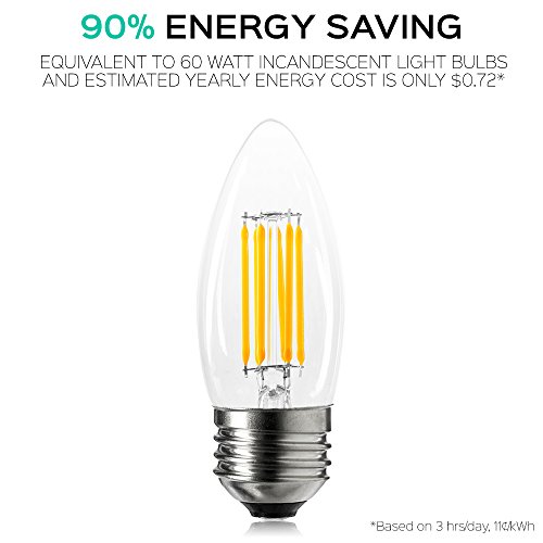 - CONSISTENT QUALITY - Clear glass with low temperature LED filaments, each light bulb is constructed to provide zero flicker and instant on lighting that lasts 10x longer than 60W incandescent candle light bulbs. NO mercury and NO UV in this eco-friendly design and is also UL Listed for your safety, so you know are getting the best in LED lighting.
