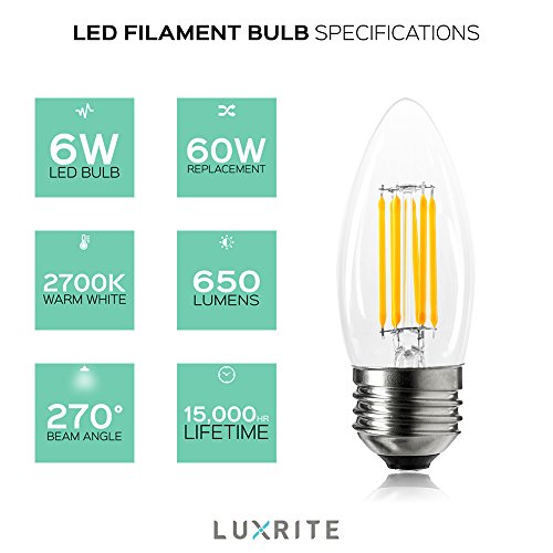 6-Pack LED Chandelier Bulb, Luxrite, 6W (60W Equivalent), 2700K Warm White, 650 Lumens, LED Filament Bulb, Torpedo Tip, E26 Base, UL Listed