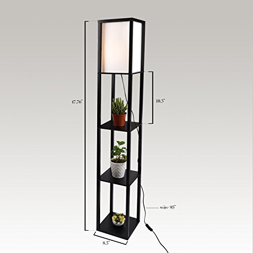 - Size detail: 63-inch tall floor lamp in an authentic wood open-box frame has 3 flat-surface 10 ¼ -inch wide shelves for displaying décor, magazines, family photos, pottery, and other small treasures. The nestles neatly into corners and also arranges nicely next to your favorite armchair. Each shelf measures approximately 15 inches long. The top shelf with 4 round 2 inch(diameter) light transmission hole