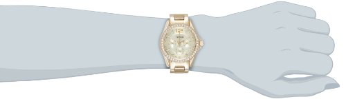 - Feature : Round gold-tone watch with 38 mm stainless steel case and mineral dial window / Analog quartz movement with analog display / Featuring three subdials, luminous hands fluted crown, champagne-colored dial, crystal-studded stationary bezel, placed hour markers with crystal embellishments, and stainless steel band with deployant buckle closure / Water resistant to 330 feet (100 m)