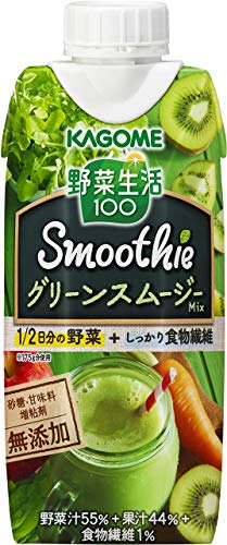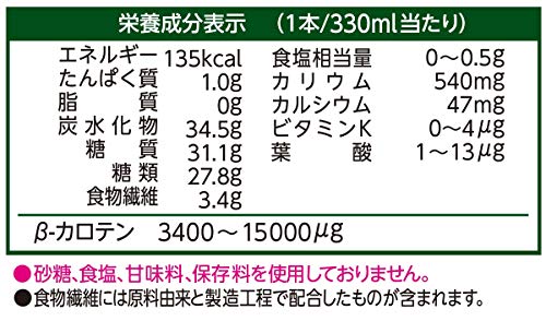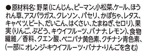原材料:野菜(にんじん、ピーマン、小松菜、ケール、ほうれん草、アスパラガス、クレソン、パセリ、かぼちゃ、レタス、キャベツ、ビート、だいこん、はくさい、たまねぎ、セロリ)、果実(りんご、ぶどう、キウイフルーツ、バナナ、レモン)、食物繊維/香料、クエン酸、ベニバナ黄色素、クチナシ青色素、(一部にオレンジ・キウイフルーツ・バナナ・りんごを含む)