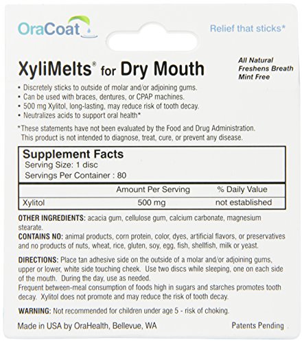 80 long-lasting oral adhering discs of XyliMelts for slow-release of xylitol (500mg) to temporarily relieve dry mouth day and night. XyliMelts discs coat, moisturize, and lubricate, while increasing saliva. Xylitol may reduce the risk of tooth decay and freshen breath. Use XyliMelts daily as needed as part of your oral care routine!Feature