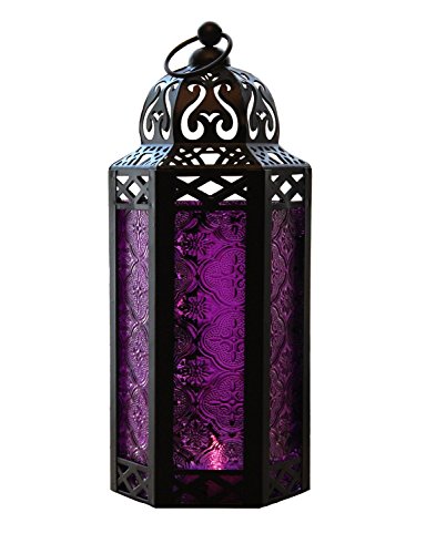 -. Feature : Not just candlelight-these lanterns add color, pattern and an exotic global vibe to your patio or porch. / Medium size lantern with large 6" high purple glass panels with large door opening / Uses tea-light, votive or small pillar candles up to 3" x 3". 4 3/8" x 3 5/8" x 10 1/2" tall, 11 1/2" tall with loop. Iron and glass. / Suitable for hanging or use as a freestanding nightlight. / Very suitable for weddings, parties, patio, events for indoors/outdoors and more.
