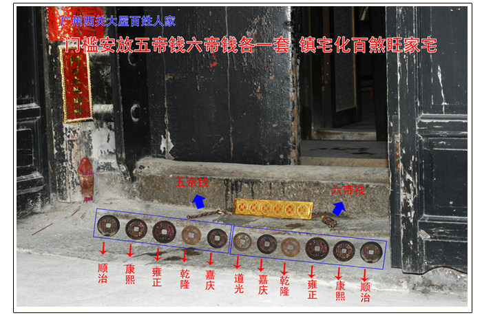 Mong Cai in the house : the order of the five emperors of ancient coins placed under a large threshold , the Five Emperors money on the threshold, overwhelmingly angular impulse radio , flying blade evil , evil guns , anti- bow evil , evil openings , the best the method is the Five Emperors money order placed under the door threshold. From left to Junji , Kangxi , Yongzheng and Qianlong , Jiaqing . This will help to resolve the evil spirits and rushed outside to enable the air within the premises of the leak does not pay attention to is the threshold higher quartile , and the order you want to put old coins , ( in the house facing the door , the order is Junji / Kangxi / Yongzheng / Qianlong / Jiaqing ) . To old coins while on foot inward and money -oriented words , there is a literal name of the emperor , if the word foot outward , will lead Jhainei discouraged.