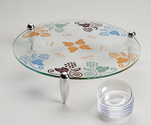 - Beautiful Elevated Glass Seder Plate With Colorful Grape Vine Designs, Includes Liners