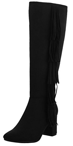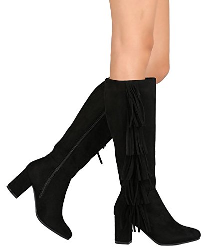 Refresh Footwear Women's Fringe Almond Toe Side Zip Chunky Heel Knee High Boot
