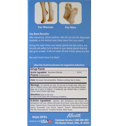 -. Binding : Health and Beauty -. Brand : Kleinert's Dry Feet -. EAN : 0045718115523 -. Feature : DECREASES SWEAT ON FEET, WATERPROOF THROUGH SHOWERING / SOOTHING ALOE & VITAMIN E - NO IRRITATION, FAST DRYING / HYPOALLERGENIC, ENLARGED 6" X 4" WIPES -8 CONVENIENCE FOIL PACKETS / SHIPS 1 TO 2 BUSINESS DAYS FROM UNITED STATES AND MADE IN THE USA / STOPS WETNESS & STAINING -. Label : KLEINERT'S -. Manufacturer : KLEINERT'S -. Model : NA -. MPN : DF01 -. PackageQuantity : 1 -. PartNumber : DF01 -. ProductGroup : Beauty -. ProductTypeName : HEALTH_PERSONAL_CARE -. Publisher : KLEINERT'S -. Studio : KLEINERT'S -. Title : KLEINERT'S DRY FEET CLINICAL ANTIPERSPIRANT WIPES. STOP SWEATING UP TO 7 DAYS. (8) PACKETS - EXTRA STRENGTH CLINICAL ANTIPERSPIRANT. XTRA ALOES AND VITAMIN E FOR NO IRRITATION -. UPC : 045718115523