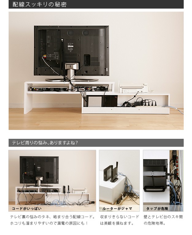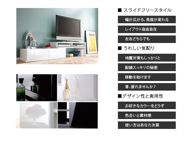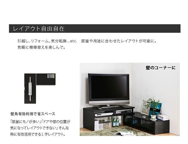 ●商品について:アイデア次第で色々使えるスライド式のTVボード。部屋の形に合わせて角度を変えられるからどんなレイアウトも思いのまま♪背面にテーブルタップを収納できるのでコード類の扱いも簡単☆前後に動くキャスター付きで配線作業、お掃除はラクラク。天板耐荷重50kg