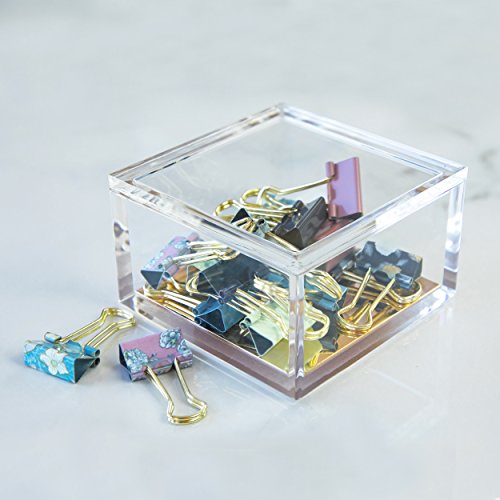 - A PERFECT FIT: The acrylic box is compact and it fits very nicely on any desk. It holds all sorts of small items that need a special spot so your desk stays neat and clean. Another great use for the box is to hold spare change, rings, makeup, barrettes or cotton balls etc. and will look great on your vanity too. It has a cork bottom so it stays where you put it.