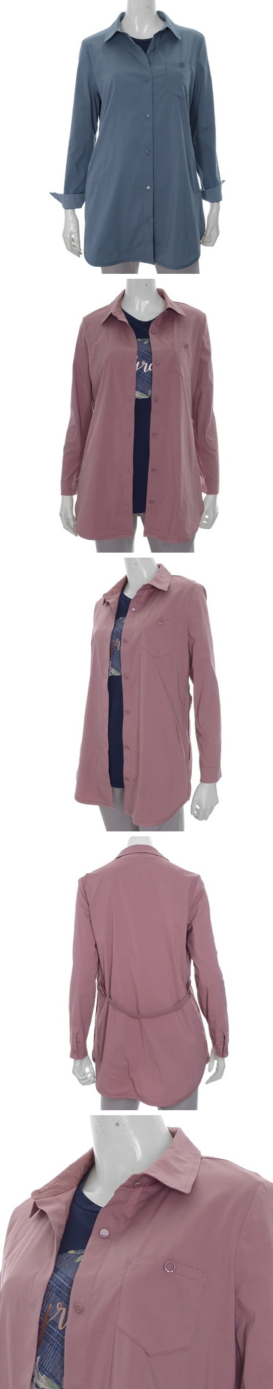 -조직감이 있어 캐주얼한 느낌을 주는 아우터 형태의 블라우스. 소매 밑가시 배색과 와끼에 스트라이프 배색으로 포인트를 준 스타일.