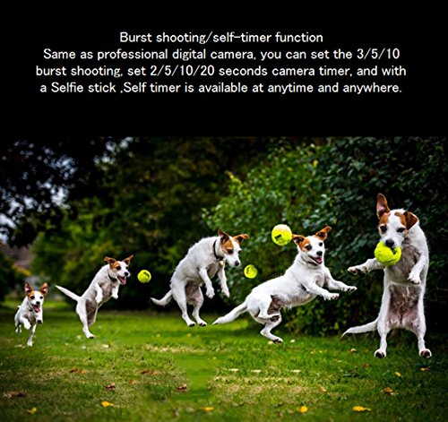 - Burst shooting/self-timer function: Same as professional digital camera, you can set the 3/5/10 burst shooting, set 2/5/10/20 seconds camera timer, and with a Selfie stick ,Self timer is available at anytime and anywhere.