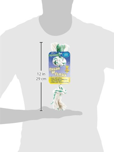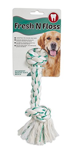 Who says flossing can't be all fun games? This eye catching, one-of-a-kind rope combines durable cotton with mint-scented "floss" to ensure a positive interactive experience. With this toy pet parents can finally get their dogs to floss! These fresh-tasting, one-of-a-kind rope toys contain wax coated nylon strands twisted in with all-natural durable cotton fibers that act as floss. Contains baking soda to fight plaque control tartar. Non-invasive non-irritating to sensitive mouths, it helps clean a dog's teeth gums, preventing plaque from forming fighting gingivitis. The Fresh N' Floss reduces the surface energy of the tooth, making it slick so that plaque can't stick