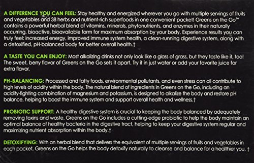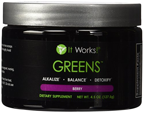 -. Binding : Health and Beauty -. Brand : It Works -. Feature : Nutritional value of 8+ servings of fruits and vegetables in every pack! / Balances pH levels to detoxify, alkalize, and boost immune system health / Blends 38 herbs and nutrient-rich "superfoods" / Delicious berry-flavored powder pack you can mix on the go / Quick, complete nutrition wherever you are! -. Label : It Works -. Manufacturer : It Works -. PackageQuantity : 100 -. ProductGroup : Health and Beauty -. ProductTypeName : HEALTH_PERSONAL_CARE -. Publisher : It Works -. Studio : It Works -. Title : It Works Greens
