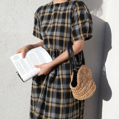 박시한 체크 원피스예요. 전체적으로 박시한 핏으로 55~77사이즈까지 착용가능하세요.