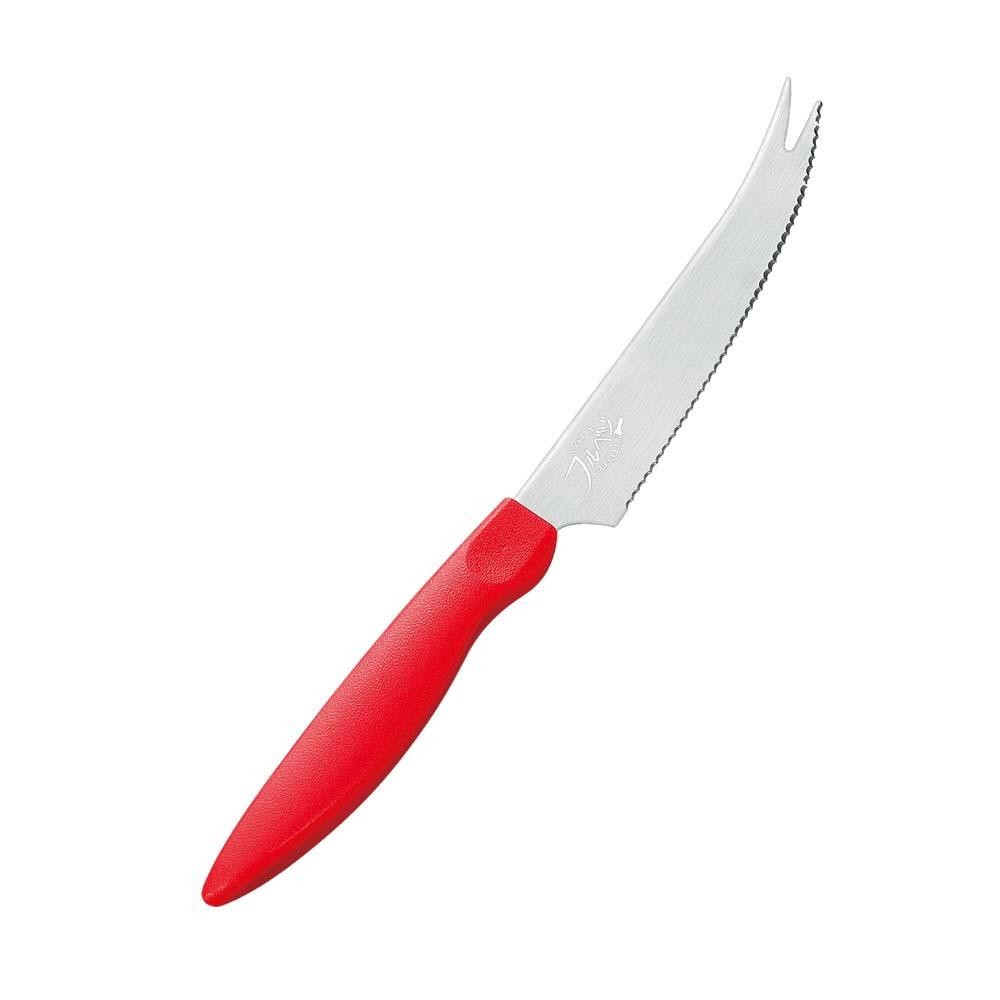 | 切りにくいトマトがつぶれず薄くキレイに切れるナイフです。カーブ刃なので食材がつながらないようにカットできます。先端がフォーク形状なので切った食材を取り分けるのにも便利です。 |