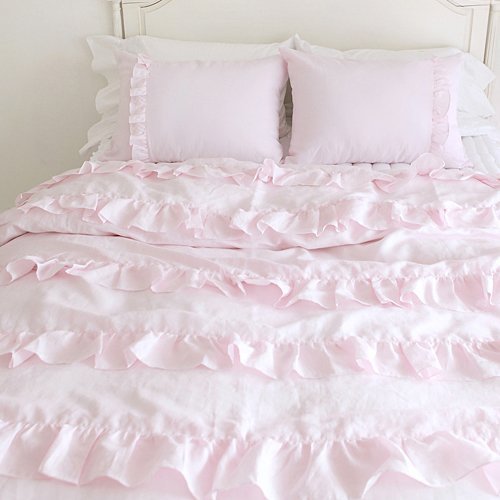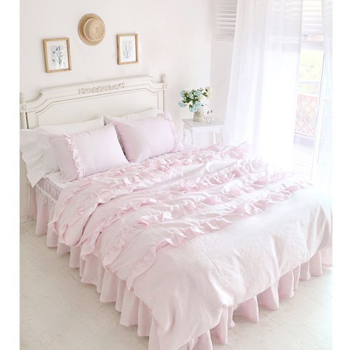 100% cotton, ruffle, perfect combination of having such bedding set laying on the bed, whole bedroom feeling is very sweet! Fine workmanship, soft and comfortable, wet absorption,can give your home fashion personality breath, high color fastness and use environmental protection dye, the fabric shrinkage according to the national standards for grade a standard testing, do not fade, not the ball.