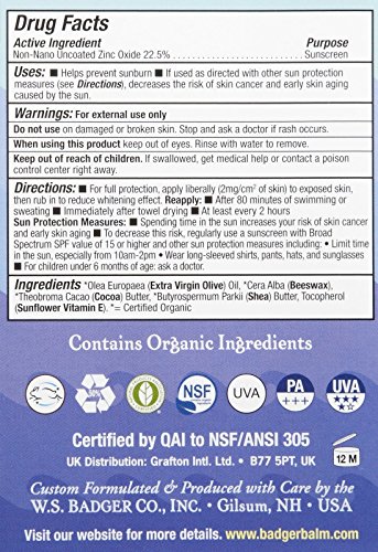 -. Feature : Broad-spectrum UVA and UVB protection for face, ears, nose, lips, and any skin with the mineral zinc oxide. SPF 35+ provides great protection from sun, windburn, and chapping during water sports, winter sports, and extra touch-up protection on the go. Certified natural and chemical-free. / Sunscreen balm base is made of only certified organic plant oils and beeswax and is ultramoisturizing, soothing, and safe for you and the environment. Naturally very water resistant: retains SPF protection up to 80 minutes. Safe for children of all ages. / Reef safe and biodegradable. Made from uncoated, non-nano zinc oxide, 22.5 %. Other ingredients: extra-virgin olive oil, beeswax, cocoa butter, Shea butter, and natural vitamin E. / 0.65 oz. stick.