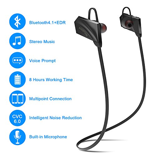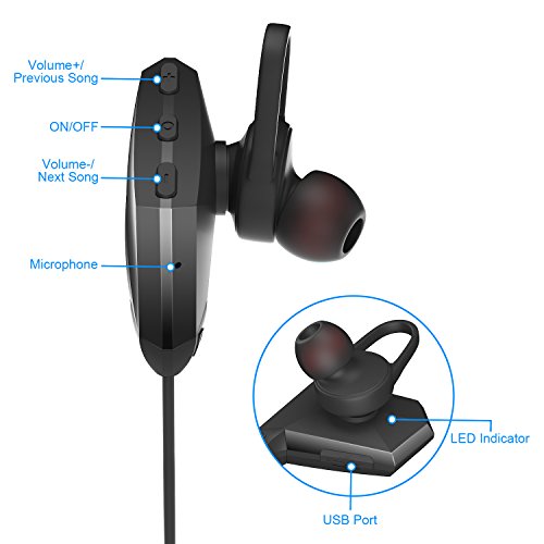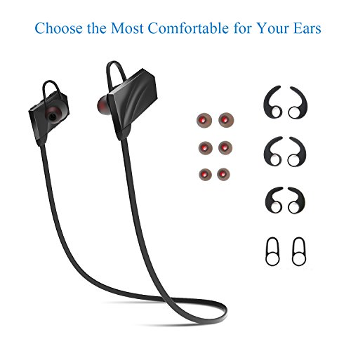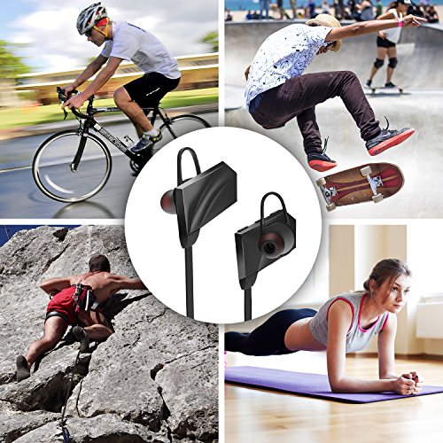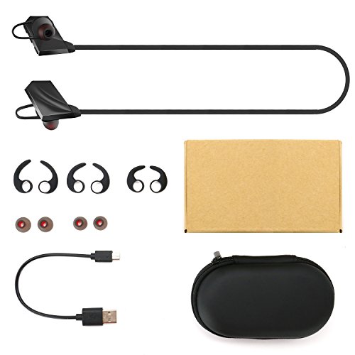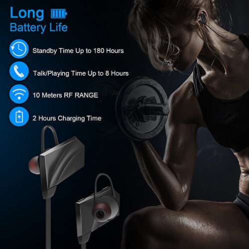 -. Feature : [ BLUETOOTH 4.1 + EDR ] Our wireless sports Bluetooth headphones are equipped with Bluetooth 4.1 + CSR chip, offer you perfect stereo sound and superb bass sound. The powerful Bluetooth signal ensures stable connect and skip-free wireless up to 33 feet. They can easy and fast pairing with your tablets cell phone, and any other Bluetooth enabled music devices. / [ CVC 6.0 NOISE ISOLATION TECHNOLOGY ] CVC noise cancellation 6.0 technology reduces outside noises, enable much more clear music and microphone sound, so you can enjoy your favorite music, no matter where you are. / [ ERGONOMIC AND FLEXIBLE IN-EAR DESIGN ] Thanks to the silicone ear hooks, our cordless sports Bluetooth headsets are secure in your ears and rest comfortably in the ear canal. Premium soft smooth silicone gel surface helps sweat proof and have comfortable wearing experience without falling out. It is great for Gym, Running, Jogging, Hiking, Cycling, or any other Indoor or Outdoor sports activities. / [ LONG-LASTING USAGE ] Up to 8 hours of play time and 180 hours stand-by time with a quick charge of only 1.5 hours. Voice prompt function enables you to know using status right now. Support automatically reporting in-coming phone number, never miss a call. Support to connect two Bluetooth devices simultaneously. / [ ONE YEAR WARRANTY - 100% RISK FREE ] We always stand by our products! We truly care our customer experience. Fast delivery - ships from Amazon US.