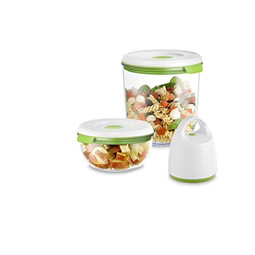 Vacuum Food Storage System - includes Vacuum unit (fits different size FOSA canisters), 1 small canister, 1 medium canister and 2 interchangeable lids.