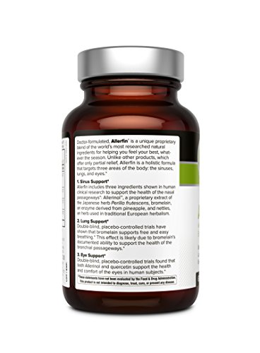 HELPS SUPPORT SINUS, LUNGS, EYES & ALLERGIES: Our sinus supplement helps support lung, nasal, bronchial and eye health. Utilizing superior natural sinus herbs, our allergy health formula helps support your respiratory system. Allerfin contains clinically researched herbs to help manage sinus, allergy and nasal health.