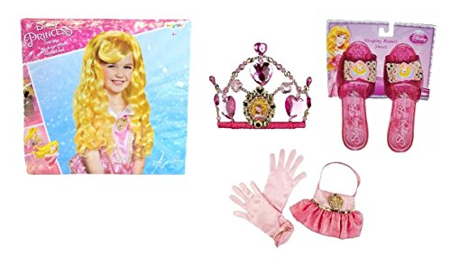 Here are the accessories you need for your Aurora Dress up set. Just add a dress (available separately), and you've got the whole costume finished!. Includes wig, purse, gloves, tiara, and shoes. These items are one-size made for girls in the 3-6 year age range. If your little Disney Princess loves Sleeping Beauty, this set is for you. Great for Halloween custume, daily dress up, or just pretend play.Feature