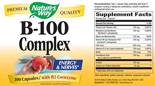 -. Binding : Health and Beauty -. Brand : Nature's Way -. Feature : 2 Bottles of 100 Capsules / for Energy & Nerves B vitamins are essential to the conversion of cellular energy, manufacture of hormones and proteins, and repair and maintenance of nerve structures / Nature's Way -. Label : NATURE'S WAY -. Manufacturer : NATURE'S WAY -. MPN : 89947 -. PackageQuantity : 1 -. PartNumber : 89947 -. ProductGroup : Health and Beauty -. ProductTypeName : HEALTH_PERSONAL_CARE -. Publisher : NATURE'S WAY -. Studio : NATURE'S WAY -. Title : Nature's Way B-100 Complex
