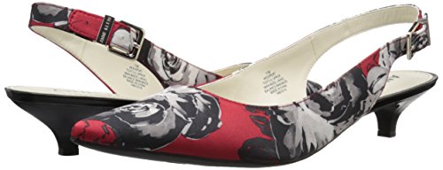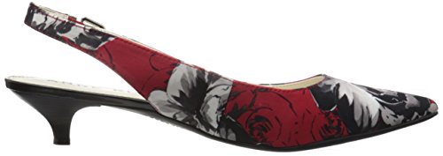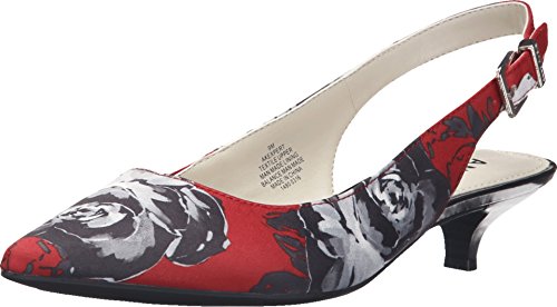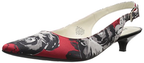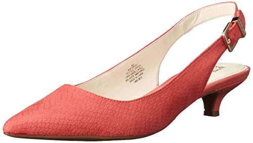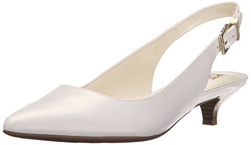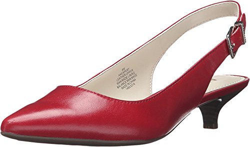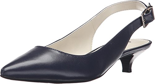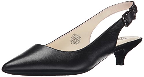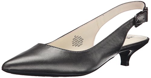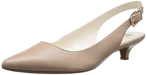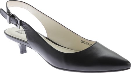 Slingback pump with pointed toe, adjustable buckle, and exposed heel counter