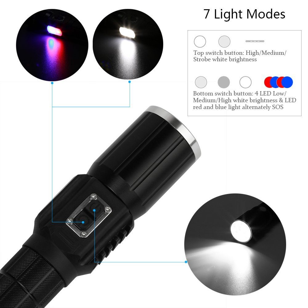 When using heavy duty handheld flashlight, stretch the flashlight head to adjust the beam. Double switch button 7 light modes: Flashlight has 7 LED bulbs, gently press the top and bottom switch button, it will change the respective mode. Top switch button: High/Medium/Strobe white brightness. Bottom switch button: 4 LED Low/Medium/High white brightness u0026amp; 2 LED red and blue light alternately SOS