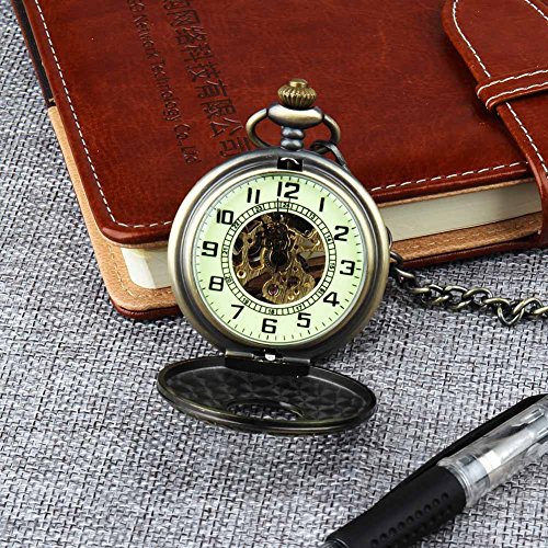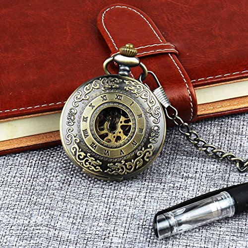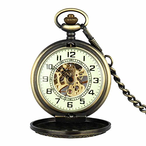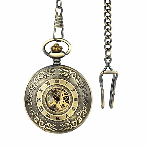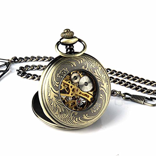 -. Title : Retro Pocket Watch for Men Women Bronze Half Hunter Case Steampunk Skeleton Mechanical With Chain + Box