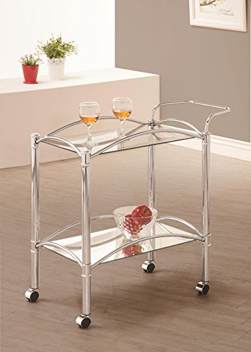 Studio : Coaster Home Furnishings Publisher : Coaster Home Furnishings Binding : Misc. Product Description Add function and fashion to your bar or kitchen area with this rolling serving cart. The perfect accent for a sophisticated transitional or sleek contemporary room, the cart is decked out in chrome with two tray surfaces. The top tray is thick, tempered glass, while the bottom shelf is mirror-plated for a fabulous and flashy finish. 0