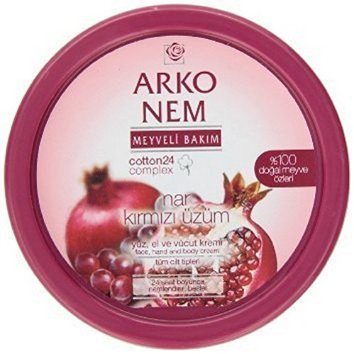 -. Binding : Health and Beauty -. Brand : Arko -. EAN : 8690810006594 -. Feature : The relaxing scent of berries and yogurt eliminates your and your skin's daily stress / It keeps your skin moisturized 24 hours a day / With its enriched 100% natural yogurt and berry extract formula / Soothes and relaxes your skin -. Label : Evyap -. Manufacturer : Evyap -. Model : ArkonemPom150 -. MPN : ArkonemPom150 -. PackageQuantity : 1 -. PartNumber : ArkonemPom150 -. ProductGroup : Beauty -. ProductTypeName : BEAUTY -. Publisher : Evyap -. Studio : Evyap -. Title : Arko Nem Pomegranate & Red Grape Face, Hand & Body Cream, 150g