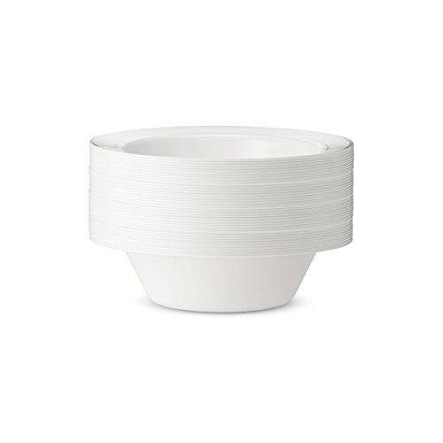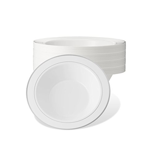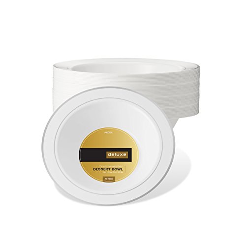 -DINE IN DELUXE!!! - High Gloss Shine...Stark Snow White ...Lustrous silver border....Rich Distinctive Look...all these characterize our DELUXE round plate collection created for sophistication and grace. Dress your table to perfection. Awe your guests with these silver rimmed dessert bowls, yet quit the hassle of washing dishes. Go green, go disposable so you're not left with a huge cleanup once your guests have left. Or, rewash and store for your next special occasion. --BENEFITS AND FEATURES-- ★Classical round shape design with silver rimmed border to set your table to perfection ★Wow your guests and yourself alike ★Heavyweight premium quality plastic to ensure no sagging, tearing or breaking ★Perfect choice for weddings, receptions, banquets, reunions, holidays, or family get-togethers ★Great for outdoor entertaining too ★Just toss these disposable dishes and be on your way!!! ★Fun and Frugal?? Wash and reuse for your next event ★Pack of 40 DELUXE heavyweight round white 6 oz dessert bowls with silver rim Isn't life better when we get together more often? Whether a backyard barbecue or an extended family reunion, we believe in the value of spending time with friends and family. Busy lives and long to-do lists often get in the way, but when we simplify events with beautiful disposables, we do get the time to get together. There's no better feeling. So what are you waiting for? Change The Look Of Your Table, WOW Your Guests With These White Gold Border Dinner Plates, And Set The Bar At An All-Time High. Type PRESTEE in the AMAZON SEARCH BOX to view our complete line of china-like dishes, plates, cutlery, party tumblers, and mini plates for your upscale celebration.TRUST US, You'll be GLAD you did!! #1Unique Round Place Setting CLICK ADD TO CART NOW!!! 0