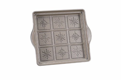 Amazon.com Review Winter cheer abounds with this lovely snowflake pan by NordicWare. Abundantly decorated for fun baking now and festive snacking later, the square shape embosses nine snowflakes complete with trimming onto shortbread, crackers, biscuits, or pan cookies. The pan's outside rim and handles are embellished as well, making this tool a lovely kitchen display piece when it's not in service. Bakers will love the heavyweight cast aluminum construction for its gentle, balanced heating that produces deliciously moist centers and lightly browned crusts. The pan also features a nonstick interior for easy food release and cleanup. Especially durable and warp-resistant, every detail transfers clearly to the baked good-simply dust with a bit of sugar or add icing for snowy effect! The pan measures nine inches in diameter and comes with a limited lifetime warranty. --Kara Karll