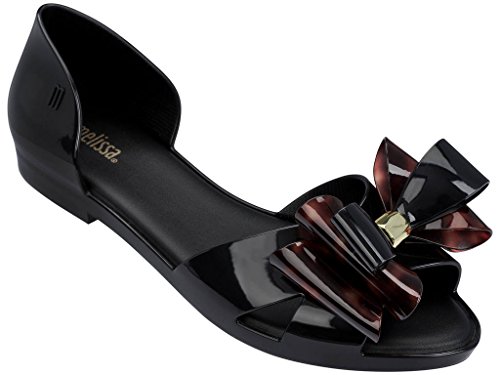 Product DescriptionA two-tone bow accents the vamp on these peep-toe Melissa flats. Padded footbed and rubber sole.0