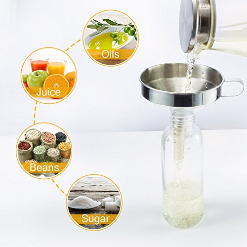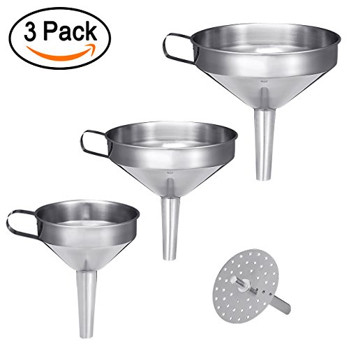 An Asset to Your Kitchen This high quality funnel set with a filter is definitely an asset to your kitchen. You can use them to pour sugar from one bag to a small sugar container, to pour syrup into a serving bottle and pour alcohol into a flask etc. And the durable stainless steel set stores easily and resists wear and tear. Lightweight Fast Flowing The funnel set is quite lightweight and convenient to use. The liquids flow through the tube quickly and easily without spilling. You can even easily handle hot liquids with the stainless steel handle. ‘No Glug’ Air Release Channel The air release channel ensures you have a mess-free workspace. It helps avoid mess and spills when infusing oils, jams, spirits and even pickles. Well, less mess, less waste! Fewer Blockages With the small but useful removable strainer, it is easy to filter the impurity substance in the liquids, making the liquids flow through the tube effortlessly. Specifications Type: Funnel Set Material: Stainless Steel Dimension: (mouth diameter) The Small One: 4.1” The Medium One: 4.9” The Large One: 5.6” The Tube Length: 3” Tube Bottom Diameter: 0.5” Weight: 11.28oz Note: Please clean them after each use! Package Included: 1x OMorc Stainless Funnel (Small) 1x OMorc Stainless Funnel (Medium ) 1x OMorc Stainless Funnel (Large ) 0 |