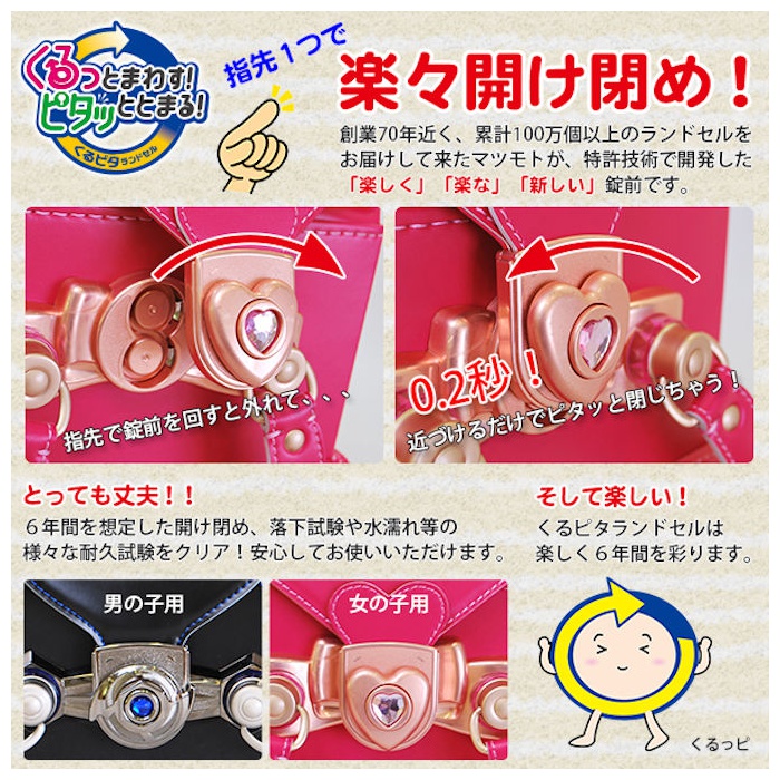 이「오는《피타》」자물쇠는 아드님이「보다 빨리」「보다 간단하게」「보다 즐겁게」란도세루(초등학생이 어깨에 매는 가방)를 개폐 할 수 있는 연구가 공을 들여지고 있습니다☆