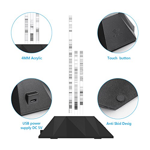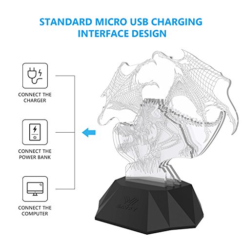 -. Feature : Illuminates in 7 colours: Red, Green, Blue, White, Purple, Yellow and Cyan / Powered by: Micro USB or 3x AAA batteries(Not include) / Change up the mood by selecting one of 7 different color modes just by pushing the control button on the base / Eco-friendly, USB Powered for Low Engergy Consumption, convenience for night operations. / Transform your office, bedroom or local gathering place with this ultramodern and stunning 3D light sculpture.