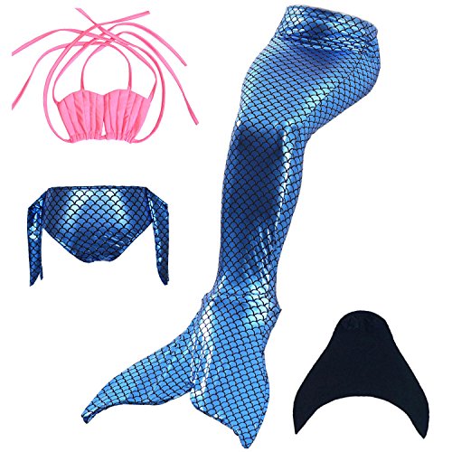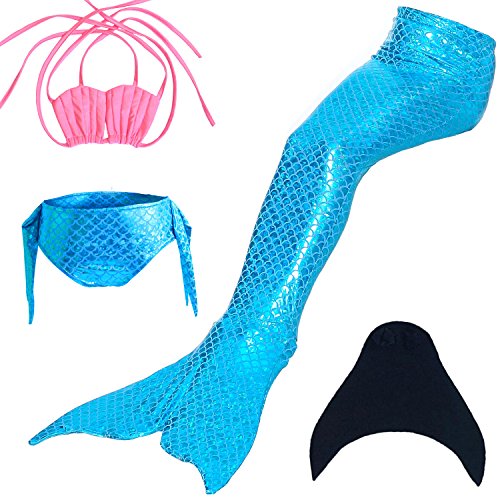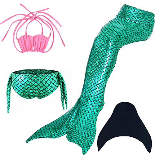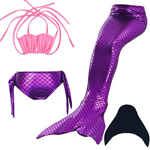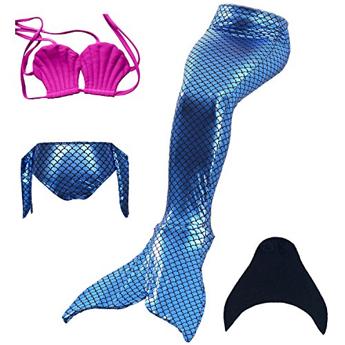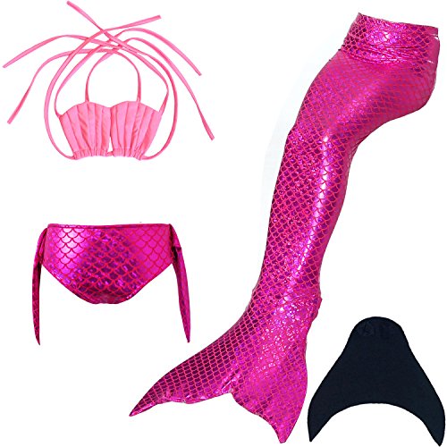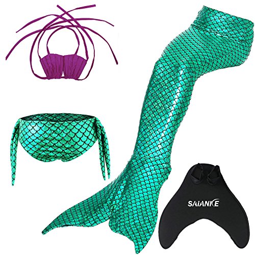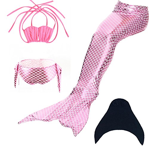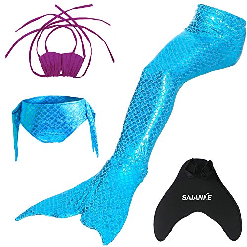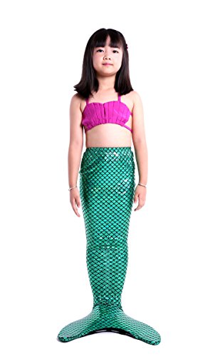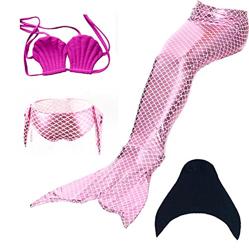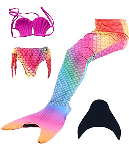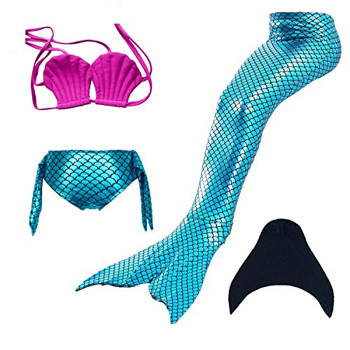 Binding : Misc. Product Description These are 4 pcs Swimming Set, includes the 1 Top, 1 Panties, 1 swimable tails 1 mono fin Size Chart(Please note that 1 cm = 0.39 inch) Child 6 (4-5 Years) Tail Length (From Waist to the short part end) 39.37 in, Waist 16.5 in, Hips 21.26 in Child 8 (6-8 Years) Tail Length (From Waist to the short part end) 41.34 in, Waist 18.1 in, Hips 22.05 in Child 10 (8-10 Years) Tail Length (From Waist to the short part end) 43.31 in, Waist 18.89 in, Hips 22.83 in Child 12 (10-12 Years) Tail Length (From Waist to the short part end) 45.28 in, Waist 19.67 in,Hips 23.62 in Washing Instructions Rinsing after use in cold water,squeezing excess water out gently. Do not twist the fabric,do not use detergent,bleach,or fabric softeners. Do not iron or dry clean,The bright shiny foil finish may fade after wear.all of the sparkly foil will come off if you run it through a washing machine! Monofin information: Comfortable and durable short blade swim fin. Great for Training and Open Water swims. Flippers use a soft foot pocket, and mid-sized blade with three channels for optimal movement of water during the kicking cycle. Features: 100% New and high quality. Easy to kick for extended snorkeling time. Lightweight, efficient and economical Rugged, durable construction Good thrust in an economical fin Channel Thrust: longitudinal inserts allow a controlled deformation of the fin blade while kicking. Specification: Material: TPR PP 0
